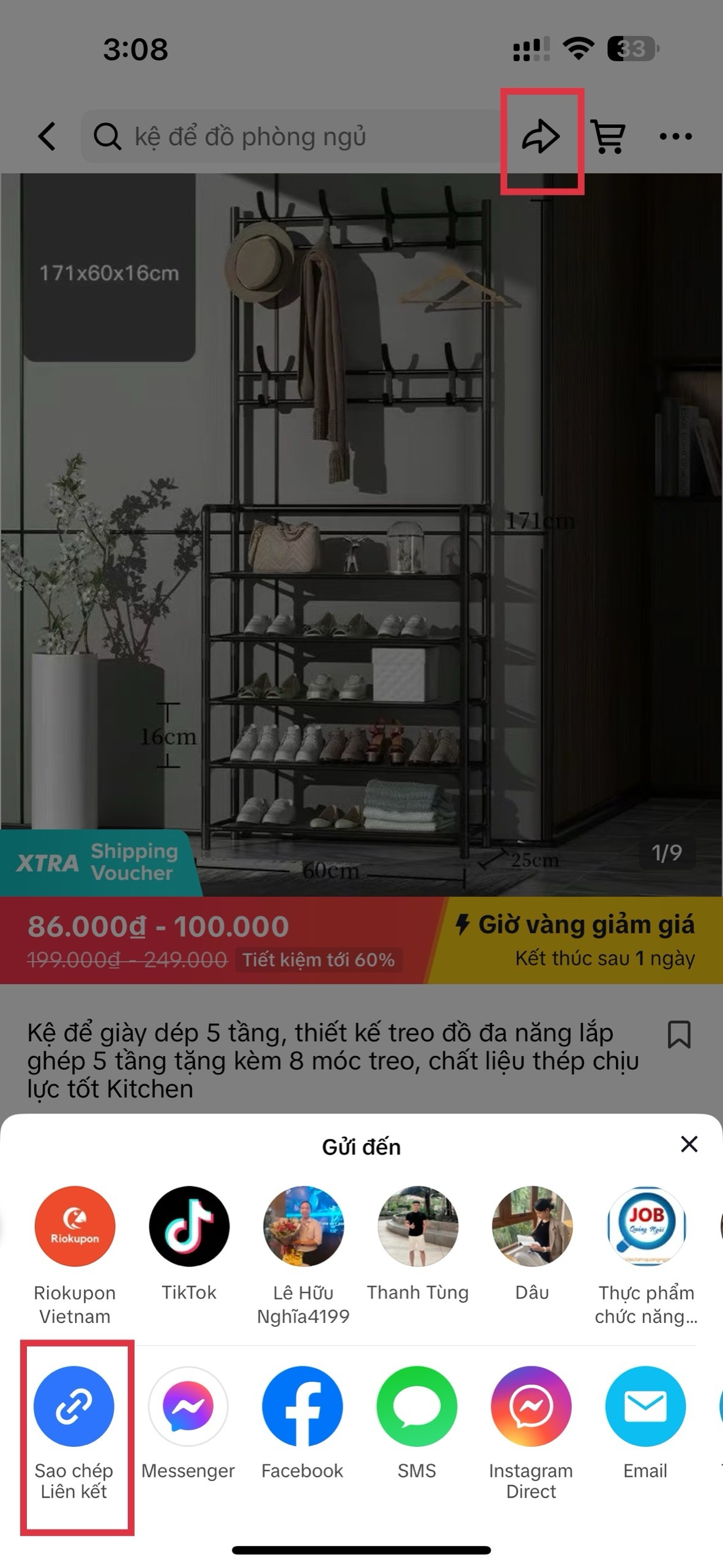 Bước 1: Copy link sản phẩm bạn muốn mua trên TikTok và dán link vào chatbot Riokupon. (nhấn vào biểu tượng chia sẻ góc trên màn hình để copy link sản phẩm)